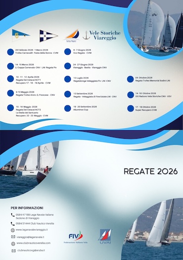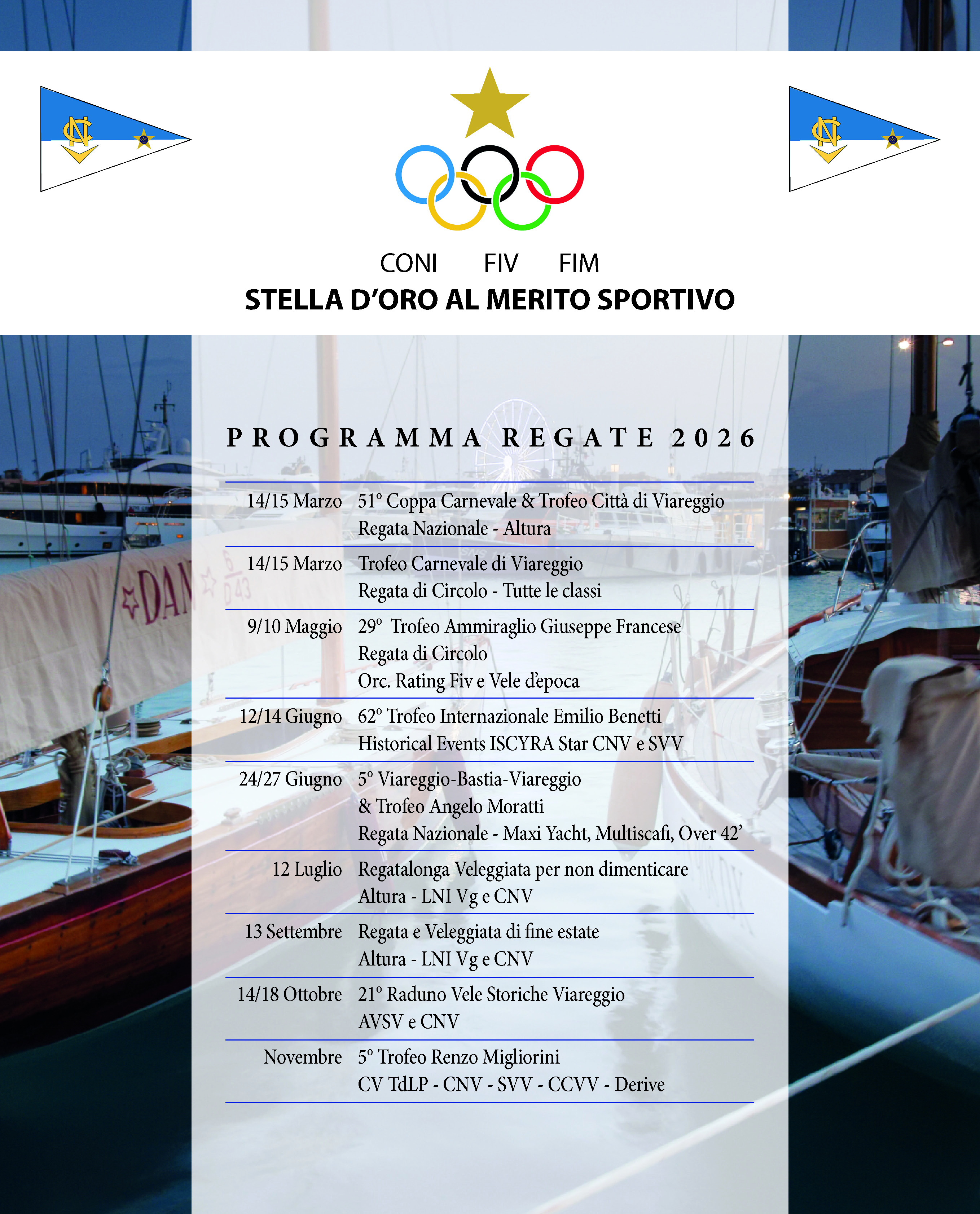 CALENDARIO PROVVISORIO REGATE E VELEGGIATE 2026 14-15 M a r z o LI Coppa Carnevale & Trofeo Città di Viareggio -Regata Nazionale - Altura. 14-15 M a r z o Coppa Carnevale di Viareggio- Regata di Circolo - Tutte le Classi. 10-11-12 Aprile Regata dei Cetacei “Delfini e Balene” (eventuale recupero 18-19 aprile), CVM. 09-10 Maggio XXVIIII Trofeo Ammiraglio Giuseppe Francese - Regata di Circolo - Orc, Rating Fiv e Vele d’epoca. 15/16 Maggio Regata dei Ce...
